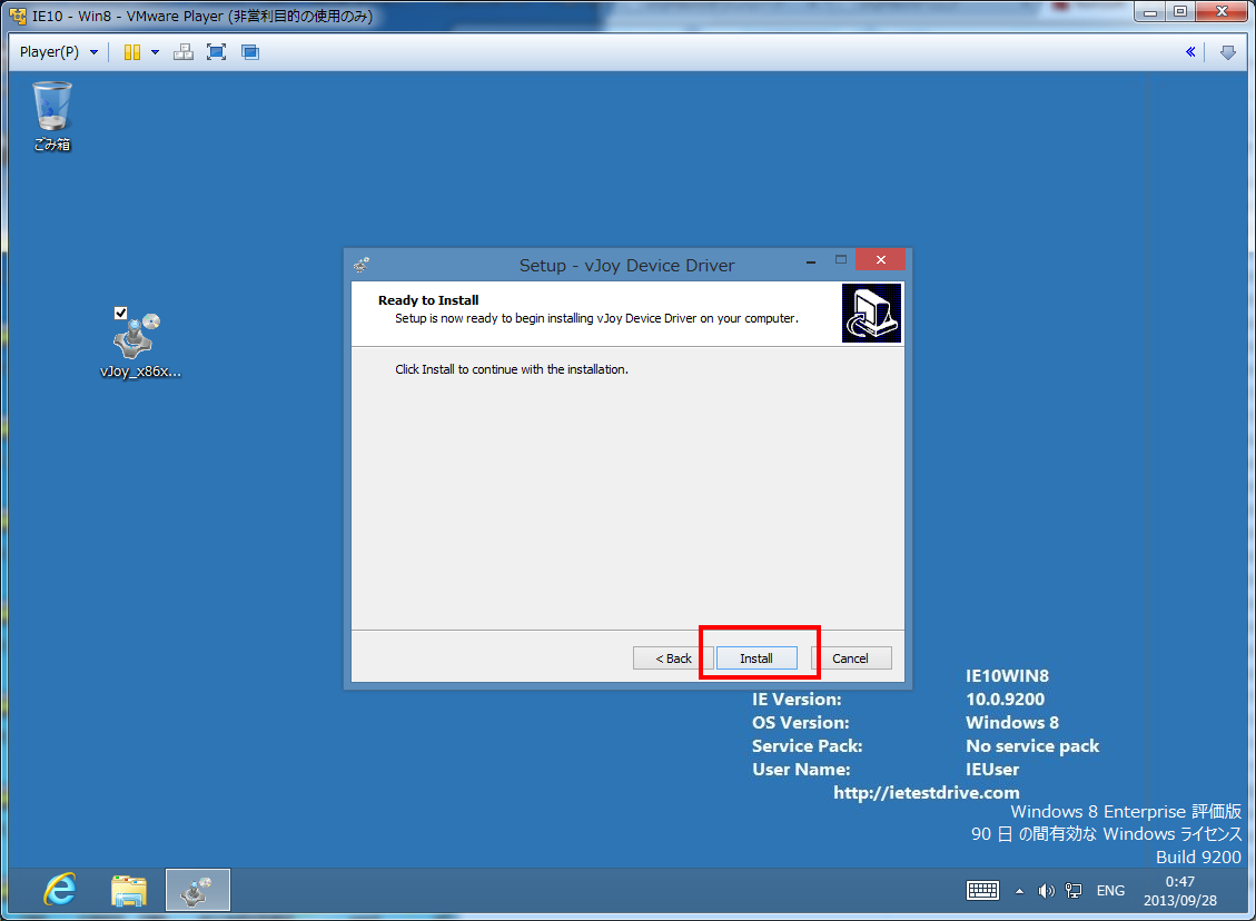 ダウンロードしたvJoyのインストーラーをダブルクリックして実行し・・・